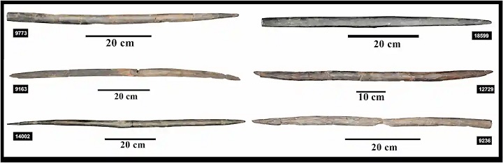 İtalya'daki Bracciano Gölü'ndeki La Marmotta batık alanından çıkarılan 19 Erken Neolitik döneme ait ahşap yaydan bazıları. Arkeobotanik analiz, bunların yapımında kullanılan altı farklı Akdeniz ağaç türünü belirledi. Kaynak: L. Caruso Fermé vd., Arkeolojik Bilimler Dergisi: Raporlar (2026).