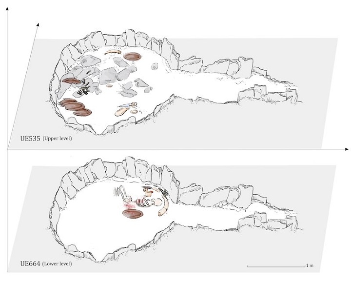 Mezarın alt katmanına gömülen kişi ve birlikte gömülen ana eserler. C: Miriam Lucianez Trivino.