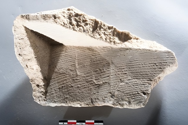 Barbegal değirmenlerinden, değirmen makinelerinin ahşabı üzerinde oluşmuş, ahşap izleri ve ahşap işleme izleri taşıyan karbonat parçası. C: Philippe Leveau