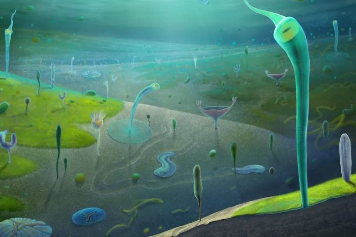 Jiangchuan biyotasının (yaklaşık 554-539 milyon yıl önce) bir sanatçı tarafından yeniden canlandırılması. C: Xiaodong Wang