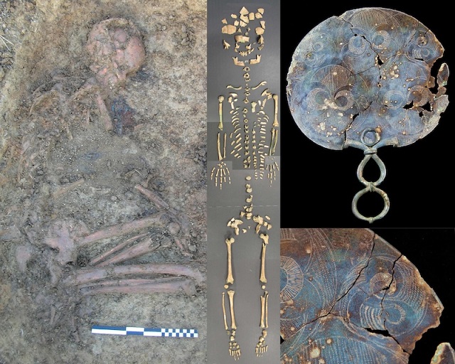 Demir Çağı kadınları genellikle değerli eşyalarla gömülürdü. Dorset’teki bu mezar, bir ayna (sağ panel) ve bir kadını tasvir eden bir Roma sikke tılsımı da dahil olmak üzere mücevherlerle gömülmüş genç bir kadının mezarı. C: Bournemouth Üniversitesi