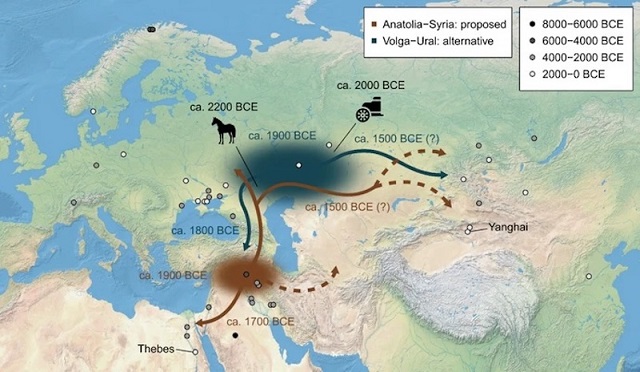 Buna karşılık, kompozit yay çok daha yakın bir biçimde başka bir devrimci icatla örtüşüyor: parmaklıklı tekerlekli savaş arabası. MÖ 2.000 civarında Urallar’daki Sintashta kültürü tarafından geliştirilen savaş arabası, kısa sürede Avrasya’ya yayıldı. Mısır Yeni Krallık dönemine gelindiğinde savaş arabası ile kompozit yay ayrılamaz bir askeri kompleks oluşturuyordu. Bu da kompozit yayın, Anadolu ve Suriye’den Volga–Ural bozkırlarına uzanan savaş arabası kullanımının kültürel alanı içinde doğmuş ve yayılmış olabileceğini düşündürüyor.