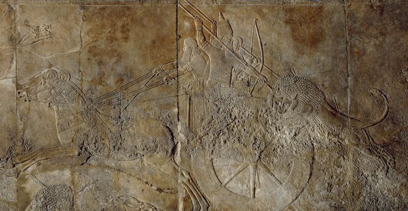 Asurbanipal’in sarayından bir kraliyet avında kralı tasvir eden taş kabartma panel. Koyuncuk (antik Ninova), MÖ 645-635. C: The Trustees of the British Museum