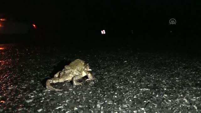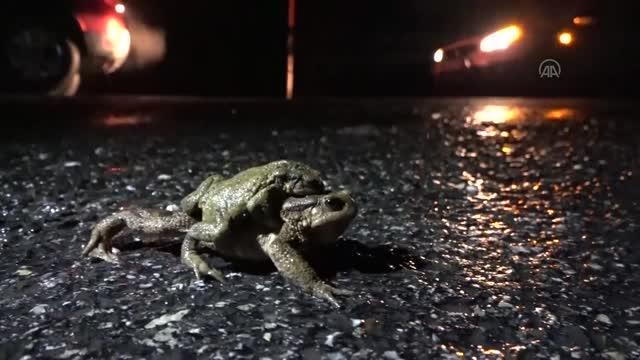 Yolun karşısına geçmeye çalışan yüzlerce kurbağa ilginç görüntüler oluşturuyor. Bazıları ise geceleri fark edilmedikleri için araçlar altında ezilerek telef oluyor.