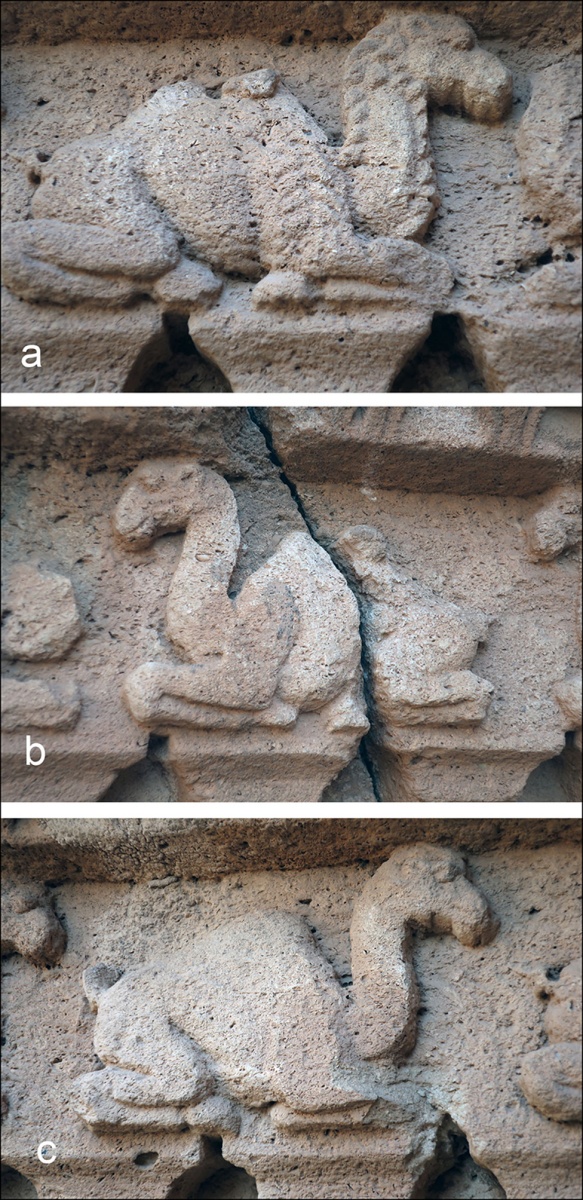 Kirişte yer alan aşınmış insan figürünün muhtemelen zamanın Hatra kralı Sanatruq'a ait olduğunu belirten uzmanlar, develerinçoğunun tipik Arabistan ve Orta Asya develeri olduğunu belirtiyorlar.Ancak onların önünde yer alan, başlarında, boyunlarında ve ön ayaklarında uzun tüyler bulunan melez hayvanlar onlardan farklı. Melezlerin hörgüçlerinde adeta onları çift hörgüçlü gibi algılatanküçük bir girinti var. Uzmanlar bunlarınbactrianus-dromedarius melezi olduğunu iddia ediyorlar.O devrin sanatçılarının; öndeki develeri, bu kadar gerçekçi ve ayrıntılı şekilde tasvir etmek için özel çaba sergilediğine dikkat çeken uzmanlara göre bunun mantığı da belli: "Kralın portresini çevreleyen melez develer, kraliyet ailesinin bu özel hayvanı bölgedeki tüccarlar için özel olarak yetiştirdiğini işaret ediyor.