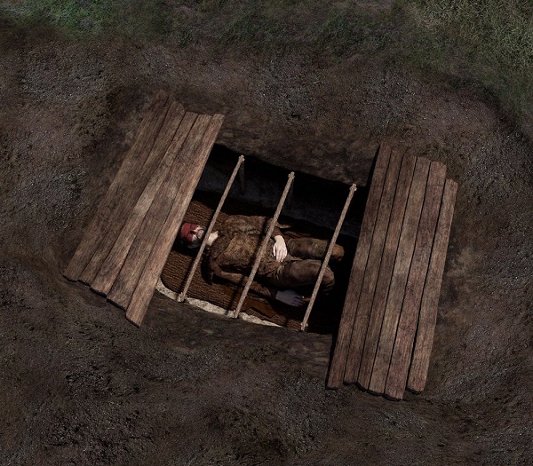 Reconstitution d'une des sépultures. L'homme est allongé sur le dos, les genoux sont repliés, la main gauche est posée sur le bas du ventre. L'ocre rouge est apposé sur le haut du visage.© MichałPodsiadło / PAP