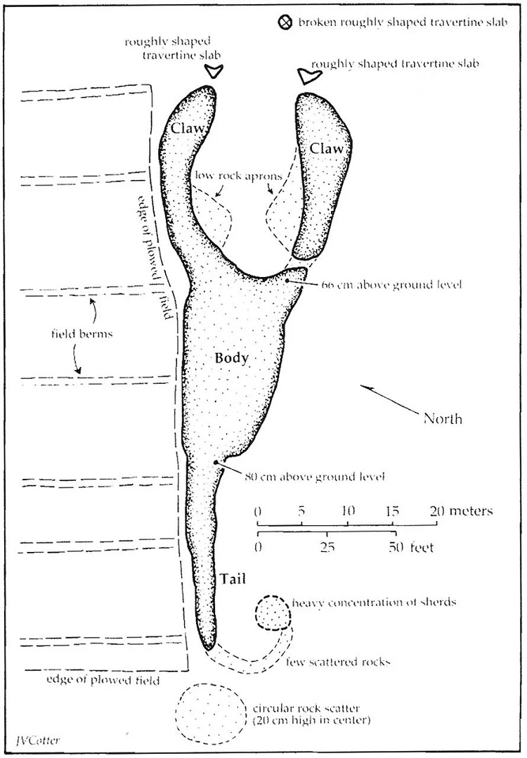 Yukarıdan bakıldığında höyüğün belirgin şekli açıkça görülüyor: geniş bir gövde, iki uzanmış pençe ve ucu sivri bir "iğne" ile biten kıvrık bir kuyruk. Yaklaşık 62,5 metre (205 feet) uzunluğunda ve 80 santimetreye (31 inç) kadar yükseklikte taş ve topraktan inşa edilen yapı, bin yıldan uzun süredir dikkat çekici bir şekilde sağlam kalmış.