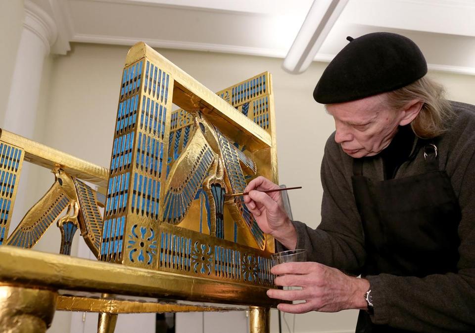 Gize Projesi’nin baş teknik sanatçısı Rus Gant, tahta son ayrıntıları ekliyor. (Görsel: Boston Globe için , Mary Schwalm) es at the Semitic Museum at Harvard.