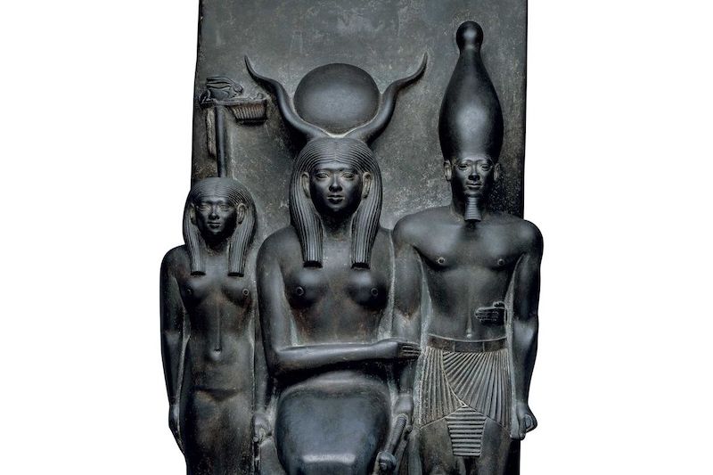 Firavun, Kahire’deki Mısır Müzesi’nde bulunan bu parçada, solda Hathor ve sağda, üzerinde hayvan formu görülen Çakal nome tanrısı tarafından çevreleniyor. Tanrıçalar, incelikli ama koruyucu bir hareketle kralın kollarını kavrıyor. (C: Flickr/Merja Attia)
