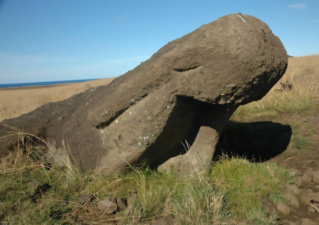 Tabanının altında kazı yapılarak yeniden dikilmeye çalışılan ve kısmen açılı bir şekilde gömülü kalan bir yol moai’sinin yıkılıp terk edildiğine dair örnek. C: Carl Lipo