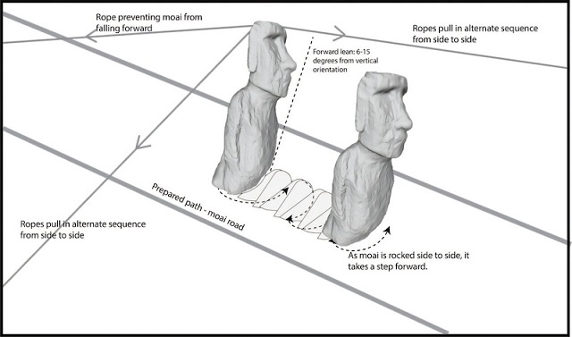 Bu teoriyi destekleyen unsurlardan biri de Rapa Nui’nin yolları. Enine kesiti içbükey olan ve 4,5 metre genişliğe ulaşan bu yollar, heykeller ileri doğru hareket ederken onları stabilize etmek için idealdi.