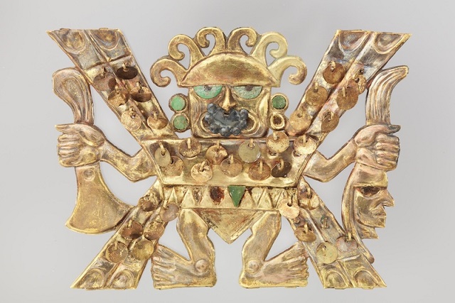 Kana susamış bir Güney Amerika tanrısını betimleyen 1.500 yıllık bu altın takı, Moche’ler tarafından burun süsü olarak kullanılıyordu.
