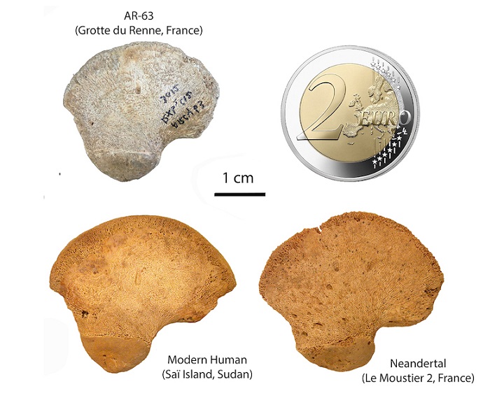 Fosilin (sol üstte), 2 Euro’luk madeni paranın (sağ üstte), modern insan kemiğinin (sol altta) ve Neandertal kemiğinin (sağ altta) karşılaştırması. C: Gicqueau, A. et al. (2023). Scientific Reports