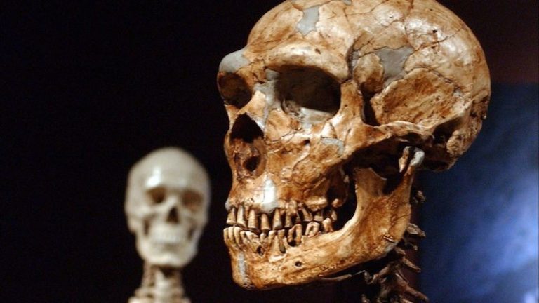 New York’taki Doğal Tarih Müzesi’nde sergilenen bir Neandertal kafatası ile modern insan kafatası. C: Associated Press