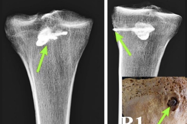 Bilgisayarlı Tomografi (BT) taramaları, kemiğin içinde metalik bir nesnenin varlığını gösteren 4000 Hounsfield birimi değerini ortaya çıkardı.