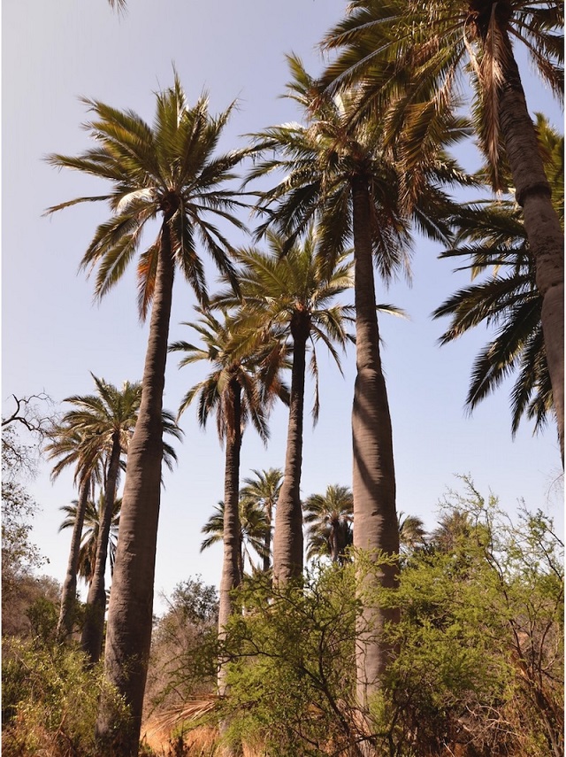 Şili’nin La Campana bölgesindeki endemik Jubaea chilensis palmiyeleri, nesli tükenmiş olan Rapa Nui palmiyesi Paschalococos disperta ile yakın akraba. C: Hunt and Lipo 2025