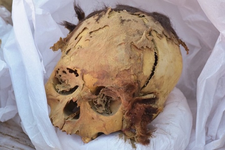 Peru’da keşfedilen genç mumyanın kafatası. Çocuk muhtemelen 900 yıl önce, 15. yüzyılda İnka imparatorluğu tarafından işgal edilmeden önce bölgede yaşayan Ichma topluluğunun bir üyesiydi.