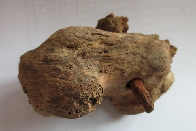 İskeletin topuk kemiğine saplanmış 5 cm’lik bir çivi bulundu. C: Albion Archaeology