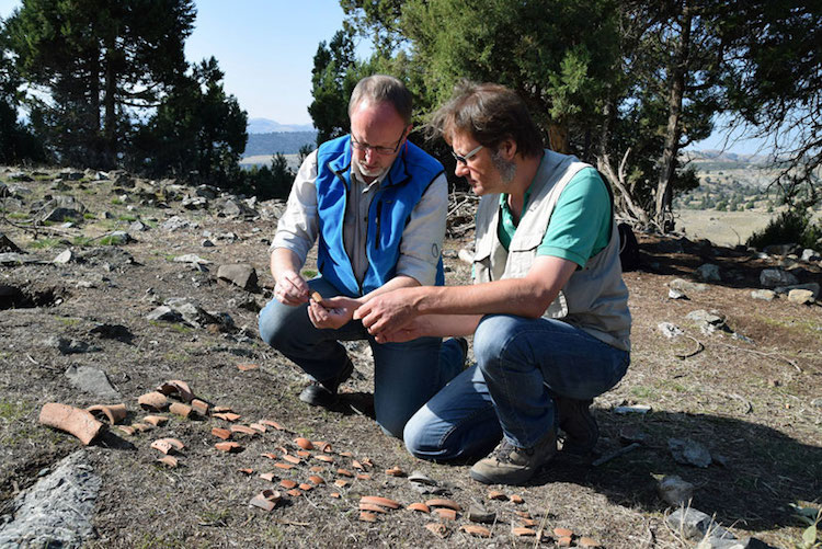Asar Tepe’de bulunan çömlek parçalarının incelenmesi, Sazak köyü yakınları. F: Oliver Hülden, ÖAW-ÖAI