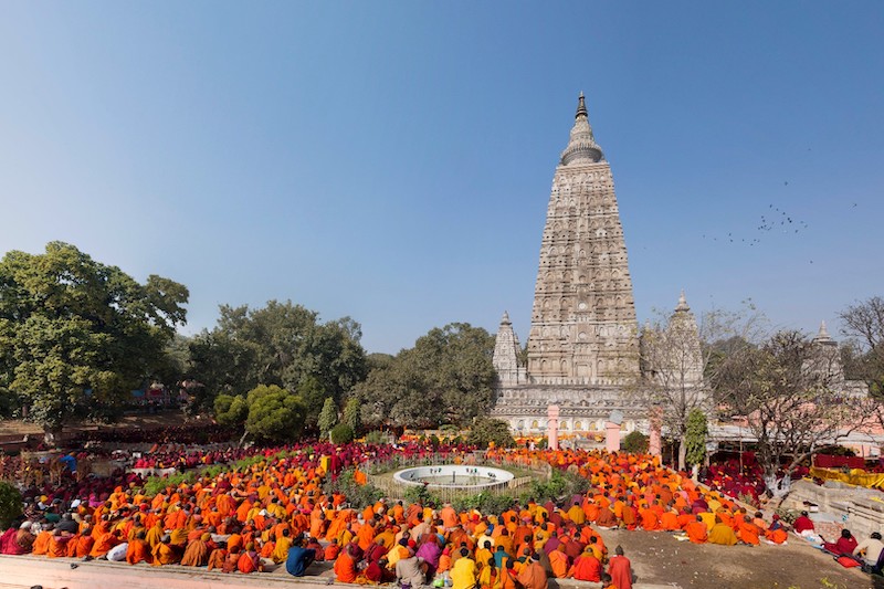 Hindistan’ın Bihar Eyaleti’ndeki Bodhgaya hac merkezinde bulunan Mahabodhi Tapınağı önünde dua eden keşişler.