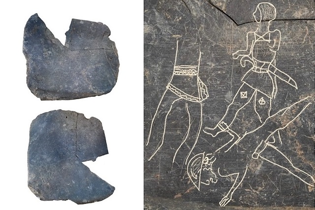 Yaklaşık 20 santimetre uzunluğundaki levhanın üzerinde aynı zamanda savaşan üç savaşçıyı tasvir eden gravürler de yer alıyor. Araştırmacılar, çizimlerin muhtemelen sanatçının benzer motifleri altın, fildişi veya ahşap parçalara oymadan önce sanatına ince ayar yapmak için kullandığı bir çizim çalışmasının parçası olduğunu düşünüyor.
