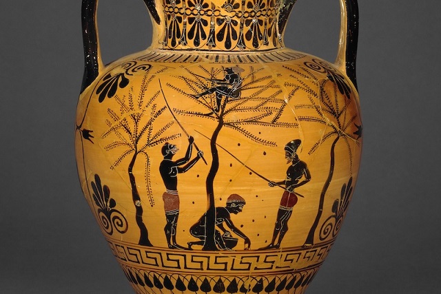 MÖ 520 yılına tarihlenen bu Attika amforasının bir yüzünde zeytin hasadı tasvir ediliyor. C: The Trustees of the British Museum