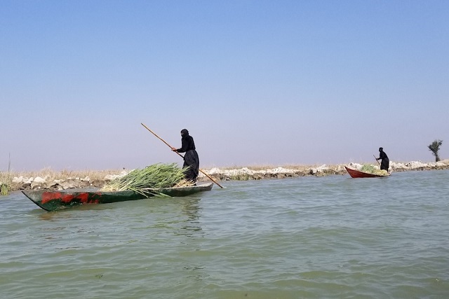 Irak’ta taze kesilmiş sazlarla yüklü mashoof adı verilen geleneksel kanolar kullanılıyor. C: Reed Goodman / Clemson Üniversitesi
