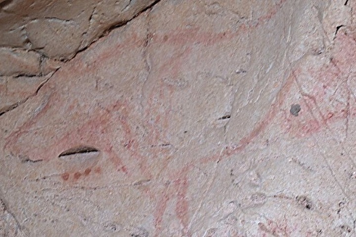 La Pasiega mağarasındaki bir yaban öküzünün resmi. Paleolitik sanatçı, hayvanın kafasını, boynuzlarını ve arka bacağını boyarken mağara duvarındaki doğal çatlakların izini sürmüştü. C: Izzy Wisher, courtesy of the Gobierno de Cantabria