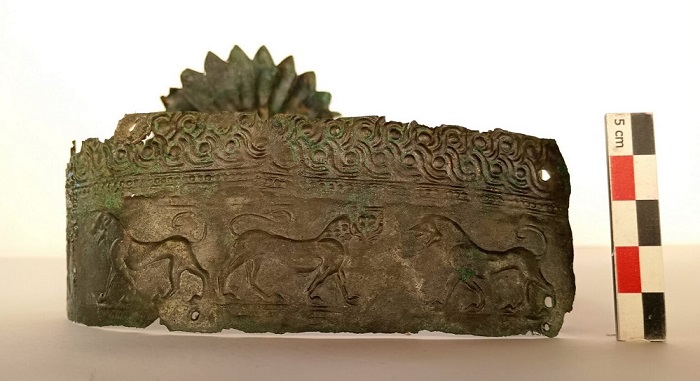 Antik Akdeniz'de egemen otoritenin sembolleri olan, erkek ve dişi, kabartma aslan çiftleriyle süslenmiş bronz taç bandı. Kaynak: Yunanistan Kültür Bakanlığı