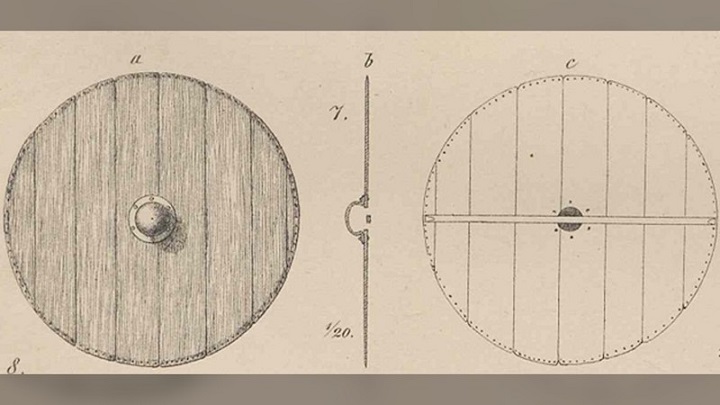 Gokstad gemisi keşfinin orijinal 1882 raporundan uyarlanan bir kalkanın çizimi. C: Nicolaysen et al. 1882