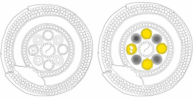 Altın diskin yeni çizimi (sol) ve dolunay (sarı elementler) ile yeni ay (gri elementler) arasındaki dönüşüm hipotezine göre diskin ikonografik temsilinin diyagramı (sağ). C: A. Cesaretti