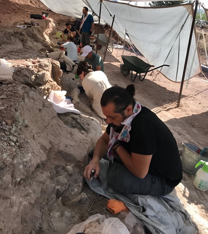 2015 yılında Türkiye’deki Çorakyerler fosil sahasında ortaya çıkarılan, oldukça iyi korunmuş kısmi bir kafatası olan Anadoluvius turkae fosilinin kazısı. Fosil, yüz yapısının büyük bir kısmını ve kafatasının ön kısmını içeriyor. C: Ayla Sevim-Erol