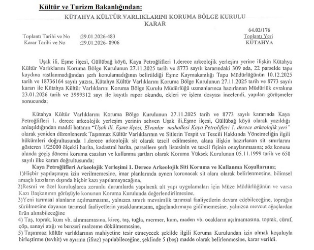 Süreç, Eşme Kaymakamlığı Tapu Müdürlüğü’nün 10 Aralık 2025 tarihli yazısı üzerine Kurul gündemine taşındı. Uzman raporları ve işlem dosyası eşliğinde yapılan değerlendirmede, 309 ada 22 parselde tapu kaydına rastlanmadığı için şerh konulamadığı belirtildi. Bununla birlikte, sit sınırlarını gösteren 1/25.000 ölçekli harita, kadastral pafta ve tescil fişi onaylanarak yürürlüğe girdi. Alanın 1. derece arkeolojik sit olarak belirlenmesi, en üst düzey koruma statüsünü ifade ediyor.