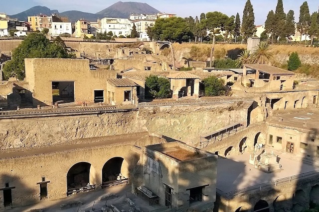 Roma’nın deniz kıyısındaki Herculaneum kenti, Pompeii’nin yaklaşık 16 kilometre kuzeybatısında yer alıyordu ve MS 79’daki Vezüv patlamasında yok oldu. Ufukta Vezüv Yanardağı görülebiliyor. C: Pier Paolo Petrone
