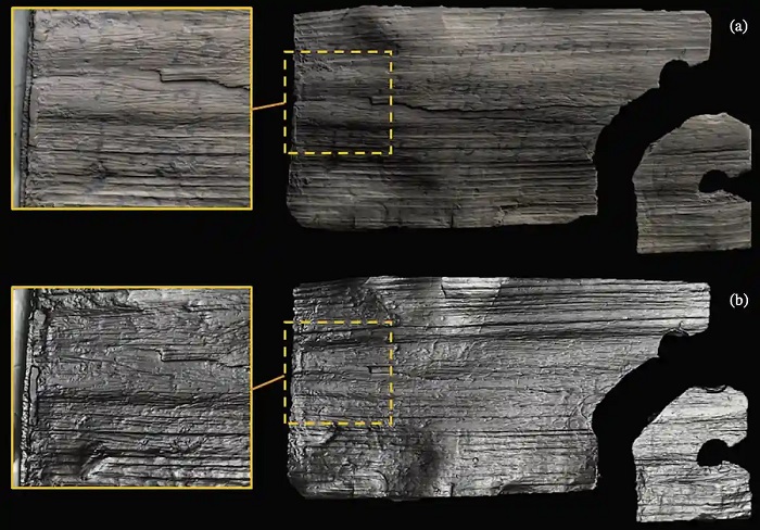 RTI görüntüleri, polinom doku eşlemesi (a) ve speküler iyileştirme (b) altında yüzey dokusunu gösteren 1995,0701.401 (VT642) numaralı tableti göstermektedir. Radyal düzlem boyunca kesilen tablette, mürekkeple yazıyla ilişkili kasıtlı girintiye dair hiçbir kanıt bulunmamaktadır. Yakın çekim detaylar, kasıtlı kesme izlerine karşılık gelen keskin kenarları ortaya koymaktadır. Kaynak: G. Vasco vd., 2026.