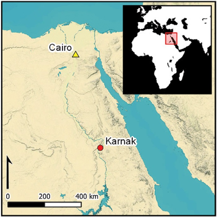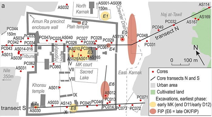 Sonuçlar, MÖ 2520 civarına kadar Karnak bölgesinin düzenli olarak hızlı akan Nil taşkın suları tarafından sular altında kaldığını göstermektedir. Bu koşullar kalıcı yerleşimi imkansız hale getirmiş olurdu. İnsan faaliyetine dair en eski işaretler , yaklaşık MÖ 2305 ile 1980 yılları arasına tarihlenen çömlek parçalarıyla desteklenen Eski Krallık dönemine aittir.