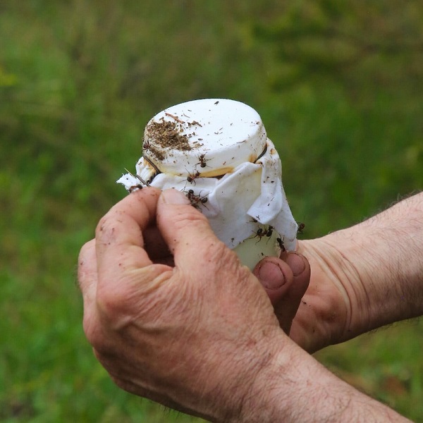 Yoğurt yapım sürecini başlatmak için, dört canlı karınca içeren bir kavanoz süt, bir karınca yuvasına gömüldü ve gece boyunca fermente olmaya bırakıldı. Koloni ısı üreterek yuvanın, bakterilerin üremesine yardımcı olacak bir kuluçka makinesi görevi görmesini sağladı. C: David Zilber
