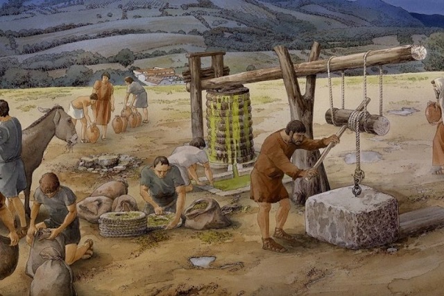 MÖ 1. yüzyılda İtalya’nın Toskana bölgesindeki Case Nuove yerleşiminde gerçekleştirilen kırsal zeytinyağı üretiminin canlandırması. C: Studio Inklink, Roman Peasant Project