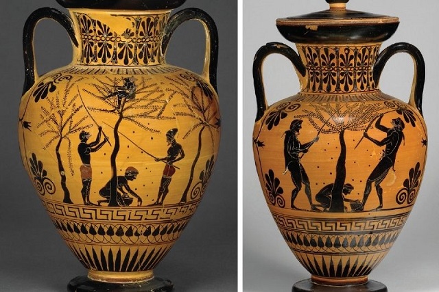 İtalya’da bulunmuş, üzerine zeytin hasadı sahneleri işlenmiş Attika üretimi siyah figürlü amforalar. Eserler Antimenes Ressamı’na atfediliyor. Solda: Vulci’de bulunan bu amfora yaklaşık olarak MÖ 520 yılına tarihleniyor ve günümüzde British Museum’da yer alıyor. C: The Trustees of The British Museum. Sağda: Toscanella’da bulunan ve MÖ yaklaşık 530–510 yıllarına ait bu amfora, günümüzde Berlin Devlet Müzeleri koleksiyonunun bir parçası. C: J. Laurentius.