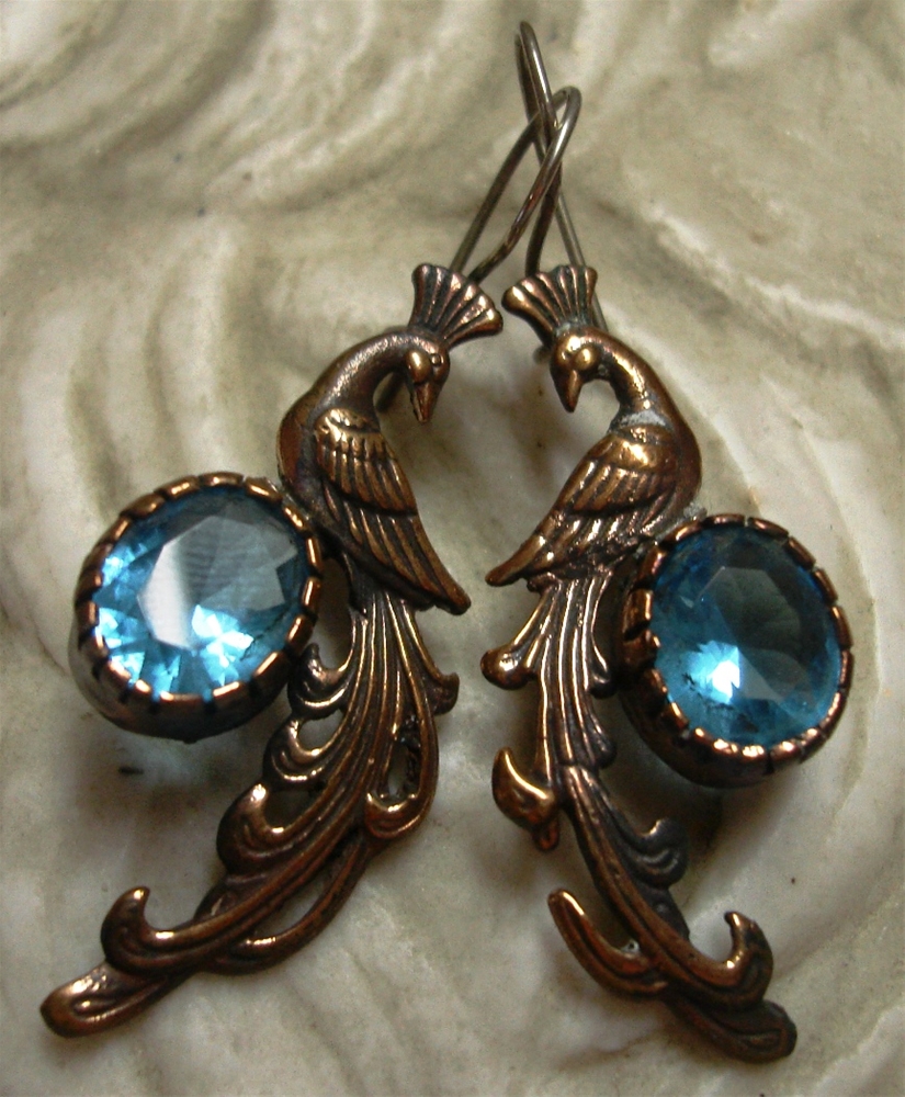 Tavuskuşu formunda, Aquamarine taş üzerine oturtulmuş bronz tasarım küpe...