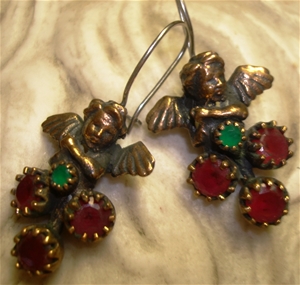 Melek formlu, etekleri 3 taş yakut ve 1 taş zümrüt ile oluşturulmuş tasarım küpe...